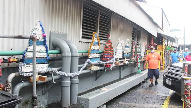 Instead of trashing wood pallets, workers with one of the departments at StarKist Samoa used the pallets to create small Christmas trees — as seen in this Samoa News photo above taken earlier this week — and then they were decorated and posted on the side of the cannery plant for the holiday season.