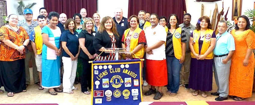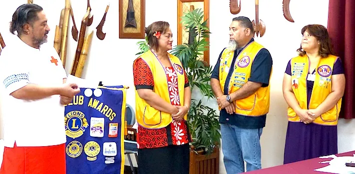 "O le taula lea, ia le toe mafai e lua loto ona ave'esea mai Amerika Samoa, toe tafafao mai aua ua mafai ona lua fa'aolatia nisi o le fanau talavou a lenei atunu'u, fa'afetai ua le gata i le fesoasoani i aiga e fa'aola mai i tulaga o le tamaoaiga mai le FEMA, ae ua lua fa'asaoina fo'i le ola,” o se fa'amatalaga lea a le tama'ita'i Peresetene o le Lions Club of Pago Pago 2018 Lisa Tuato'o, i le taimi na taua'ao ai fa'ailoga ia Victor Inge ma le fa'ailoga mo Del Vecchio i le ali'i o Fenton e malaga ma ia i Hawaii.