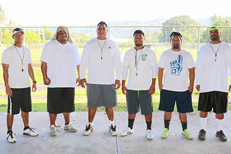 Lions coaching staff led by Head Coach Okland Salave'a (center) posing for a group photo just before practice. Salave’a is the former head coach for the Tafuna High School football program — leading them to a ‘3-peat’ football championship, a THS record. However, last year, the Vikings defeated the Warriors stopping THS’ dreams of a 4-peat record. [photo: TG]