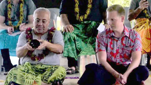 Apia, SAMOA — Award winning musician and son of the late jazz legend, Mavis Chloe Rivers was welcomed in an Ava Ceremony shortly after he arrived in Samoa this week. La’auli Matt Catingub is seen here accepting his Ava during a welcome ceremony.