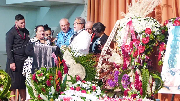 Members of the Sword family singing in memory of Utu Abe Malae at the Gov. H. Rex Lee Auditorium Wednesday evening during Utu's family service. Prior to the song, Gary Sword (in white) spoke about Utu, who is considered a brother to the family. Gary also presented to Utu’s sister, a plaque from the Commonwealth Utilities Corp. where Utu served as executive director several years ago in the Northern Mariana Islands (CNMI). Ute will be laid to rest later today following a church service at the CCCAS Amouli. [photo: Leua Aiono Frost]