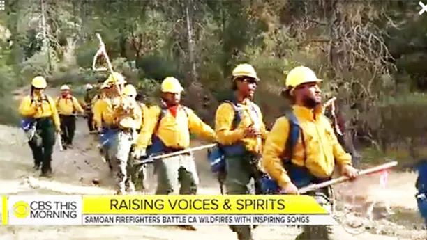 CBS This Morning on Tuesday, featured the National Park Service's Samoa 61 Fire Crew — the 17 guys from a "little dot on the equator," as Anthony Wyberski, one of the team's vets, describes it. For the past five summers, he's made the almost 5,000-mile journey north along with a group he calls his brothers. "We try and bring back our culture, our fa'a Samoa," he told CBS reporter Mireya Villarreal as tape of the group singing as they march along a flame-surrounded path through the forest plays. [CBS screen shot]
