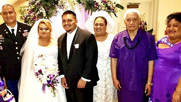 The ceremony and reception at Hale Koa hotel in Hawai’i on Tuesday, December 26, 2017. Pictured with the happy couple are the bride’s Family from Faleniu.