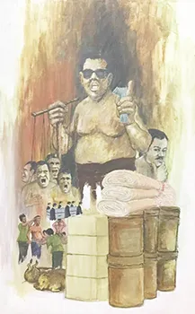 In this painting, the artist reportedly said he wanted to record the affect of the faalavelave on our daily lives — where we are seemingly the ‘puppet’s of our chiefs/ matai — who insist we give without thought to what we can afford, for the glory of ‘aiga’ — the family.