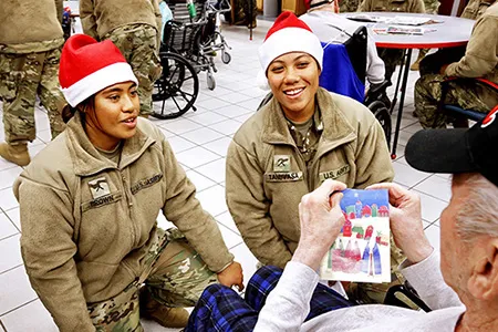Pictured are PVT Brown, Faipule and PVT Tanuvasa, Marilyn giving a card and visiting with one of the Veterans at the Veterans Center in Norman.