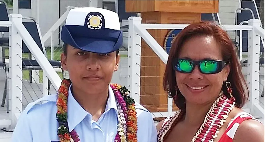 Petty Officer 1st class Fairburn Moesogi Tupua of Vaitogi and Leone following her graduation from training earlier this month is pictured here with her sister, Jackie Tupua Tulafono who attended the ceremony.