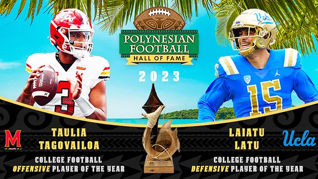 Honolulu, HAWAII —  UCLA Defensive Lineman Laiatu Latu, of Tongan ancestry, and University of Maryland Quarterback Taulia Tagovailoa, of Samoan ancestry, have been selected as the 2023 Polynesian College Football Offensive and Defensive Players of the Year. The Award is presented annually to the most outstanding Polynesian college football player that epitomizes great ability and integrity.