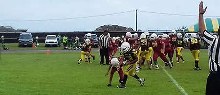 Next up was Division 2 action, which is for 5th and 6th graders, with the number one ranked JPS Lions going against the JPS Warriors. The Warriors took the lead early on in the game with a 15-yard touchdown pass to #4 Sapani Lepule with 30 seconds left in the 1st Quarter. The Wildcats would do a good job holding on to the lead until late in the 2nd Quarter when Lions running back Metuliki Tupou sidestepped and fended off defender for a beautiful 42-yard touchdown. The momentum was on.