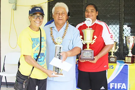 FFAS President Faiivae Iuli Alex Godinet and executive committee member Amio Mavaega-Luvu were on hand for the trophy awards.