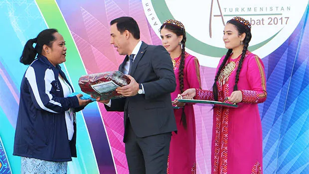 Gifts were exchanged between the Ashgabat 2017 Games Athletes Village Mayor and the National Olympic Committee (NOC) of each country. Chef de Mission for Team American Samoa Herrietta Molesi presented American Samoa’s Gift while wrestler Zena Iese, the first American Samoa Athlete to arrive at the games cheered from the crowd.